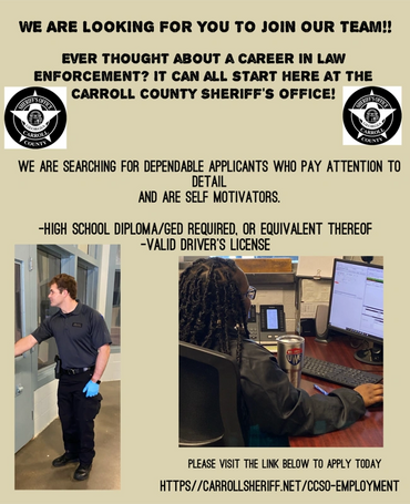 The Carroll County Sheriff's Office is an equal opportunity employer. Applicants must complete an application from the Carroll County Sheriff's Office. The application may be downloaded. Please follow the application instructions.
